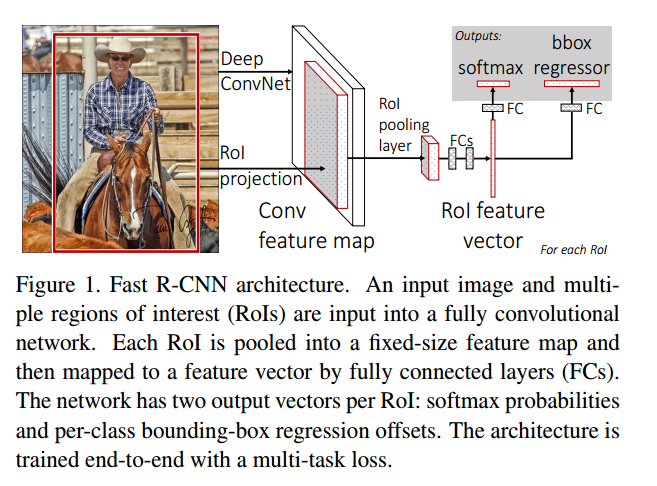 a. Multi-task loss. Fast R-CNN网络具有两个兄弟输出层。第一个输出离散概率分布(每个RoI),,超过K + 1个类别。通常,p由完全连接层的K + 1输出上的softmax计算。第二个兄弟层为每个K个对象类输出边界框回归偏移$t^k = (t^k x,t^k _y,t^k _w,t^k _h)$,由k索引。我们使用[9]中给出的$t^k$的参数化,其中指定相对于对象提取的尺度不变的平移和对数空间高度/宽度转换。
